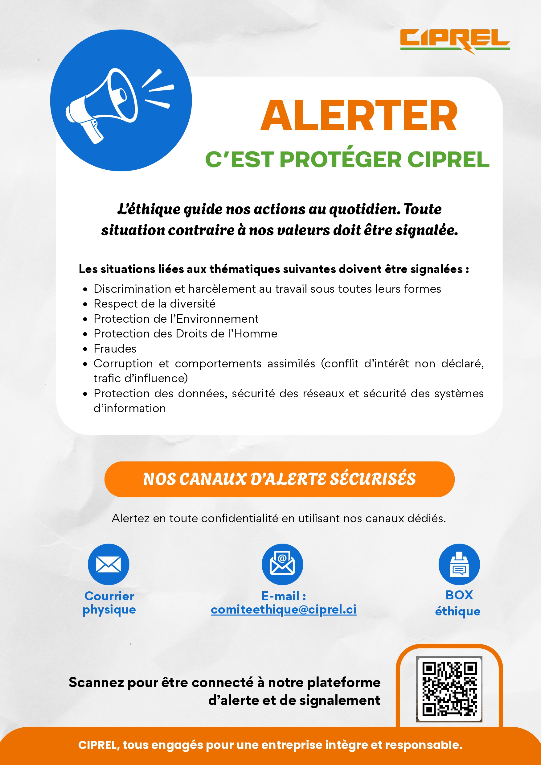 Dans le cadre de son engagement en faveur de l’éthique, de l’intégrité et de la transparence, CIPREL met à disposition de l’ensemble de ses parties prenantes un dispositif de signalement sécurisé et confidentiel.